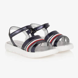 White sandals for teen girls by Tommy Hilfiger, instantly recognisable by the American brand. These easy-to-wear sandals have a tricolour stripe running through the front straps, and are finished with a red glitter stripe adding a touch of glamour. The ankle strap is velcro for an easy fit, and showcases the brand's classic logo for instant designer appeal. The metallic silver insole is padded for ultimate comfort and they have a rubberised, ridged outer sole.