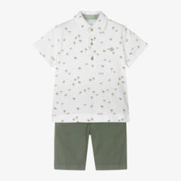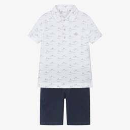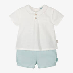 A boys blue striped shorts set by Tutto Piccolo features a charming striped cotton shirt with a mandarin collar and decorative buttons on the front. The waffle-textured cotton-blend shorts have a gently elasticated waist, providing a comfortable adjustable fit. Last chance to buy this elegant outfit, perfect for spring and summer adventures.