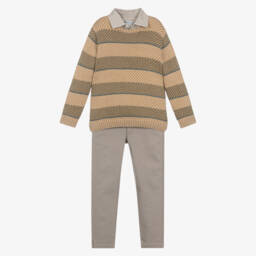 Smart-casual three piece outfit set for boys by Spanish brand, Tutto Piccolo. The white cotton twill shirt has a blue, beige and white check pattern, a chest pocket and button fastenings. It pairs with chino-style, navy blue cotton trousers that have slanted front pockets and button-fastening back pockets. They fasten with a zip and button and have a comfortable adjustable waistband. Completing the set is a cotton-blend ribbed knit jumper with a pattern in coordinating colours and striped ribbed trims.