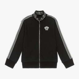 Casual style for little boys by Versace, with this grey zip-up top. Patterned with the luxury Italian designer's La Greca pattern in black, it has a white panel across the front with a bold black logo print. Made in comfortable cotton jersey, it has concealed pockets, cosy ribbed trims and a logo-embossed zip pull for a branded finish.