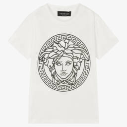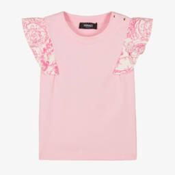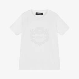 The girls white tee with pink logo features a charming cartouche print by Versace, crafted from luxuriously soft cotton jersey for a comfortable fit. The elegant pink design on the front adds a touch of sophistication, perfect for any casual outing. With its easy-to-wear style, this T-shirt effortlessly combines fashion with comfort. Limited quantities available, so secure this stylish piece for your little one's wardrobe today.