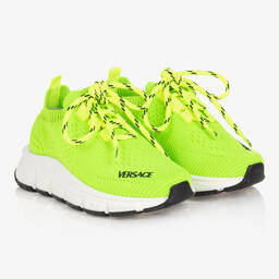 Black and white lace-up trainers for teen boys and girls by luxury Italian label Versace. Crafted in Italy, these stylish Trigreca trainers have knitted fabric uppers, smooth leather insoles and a logo print on the toe for instant brand appeal. The contrast rubber outsole is gently cushioned for support and moulded with the iconic Greca pattern for a statement look. They have a three-dimensional neon green Medusa logo built into the heel and a signature Greca tread.
