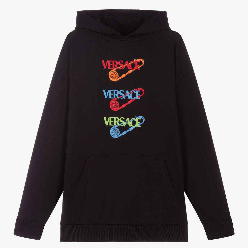 Inspired by the brand's classic logo with a twist, black hoodie for teen boys by luxury Italian brand Versace. Colourfully embroidered with the iconic Medusa logo and safety pins, this casual hoodie is made in soft cotton sweatshirt jersey.