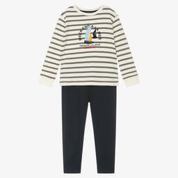 The boys nautical stripe leggings set by Week-end à la mer offers a charming blend of style and comfort. Crafted in soft cotton jersey, the set features a long-sleeved top with classic Breton stripes and an embroidered bird and buoy motif, adding a nautical charm. The yellow leggings are designed with an elasticated waist and a contrasting striped pocket for playful style. Limited quantities available, great choice for little adventurers.