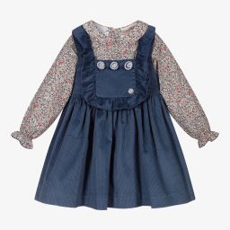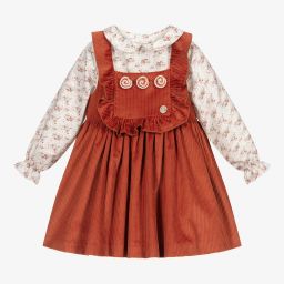 A lovely two piece dress set for little girls by Spanish brand Artesania Granlei. The ivory cotton blouse has a rounded collar, with a pretty brown and grey floral pattern. The rust brown pinafore dress is made in soft corduroy, with a ruffle trim and knitted flower appliqués.