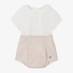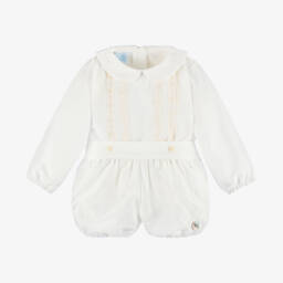 Boys blue and white buster suit by Artesanía Granlei features a charming set with a short-sleeved top and matching bloomer shorts. The top, crafted from soft cotton, showcases a subtle striped pattern, tonal lattice embroidery, and a Peter Pan collar, fastening with back buttons. The tulle-covered poplin shorts have a lightweight lining, pleated detailing, and a partially elasticated waistband, attaching to the top with buttons for a complete look. Limited quantities available, so don't miss your last chance to buy.