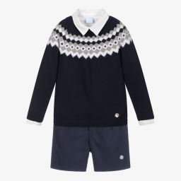 Boys shorts set by Artesania Granlei, with a brown soft knitted jumper. It has a white and grey jacquard pattern across the chest and shoulders. The shirt has front button fastenings and a chest pocket. The mustard yellow shorts are elasticated at the back, with a zip fastening, mother-of-pearl button and adjustable waistband.