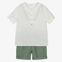 The boys green knitted shorts set by Artesanía Granlei is a charming ensemble for little boys. Crafted from a soft cotton blend, this traditional set features a short-sleeved top with a pointed collar, ribbed panel detailing, and a sweet button embellishment. Easy to wear with button fastenings on the back, the coordinating shorts have an elasticated waist for comfort. Both pieces include a mother-of-pearl monogrammed charm. Limited quantities available.