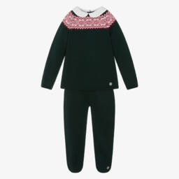 Boys grey Fair Isle knit trousers set by Artesanía Granlei exudes classic charm with its beautifully crafted design. The set features a soft jumper adorned with a striking red Fair Isle pattern across the chest, complemented by a neat white collar. Paired with cosy trousers, this ensemble ensures warmth and comfort for cooler days. Easy to wear with practical button fastenings on the back, it's perfect for stylish outings. Limited quantities available, so don't miss the chance to own this exclusive piece.