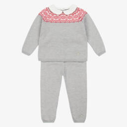 Boys grey Fair Isle knit trousers set by Artesanía Granlei exudes classic charm with its beautifully crafted design. The set features a soft jumper adorned with a striking red Fair Isle pattern across the chest, complemented by a neat white collar. Paired with cosy trousers, this ensemble ensures warmth and comfort for cooler days. Easy to wear with practical button fastenings on the back, it's perfect for stylish outings. Limited quantities available, so don't miss the chance to own this exclusive piece.