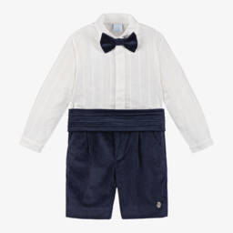 This boys velvet green shorts set by Artesanía Granlei is crafted for special occasions. The pale green velvet shorts are paired with a white cotton shirt featuring delicate stripes and a covered button placket. Complete with an adjustable waistband, velvet bow tie, and cummerbund-style belt, this set offers a great fit and sophisticated look. Featuring the brand's mother-of-pearl charm, this elegant set is available in limited quantities, making it a last chance to buy.