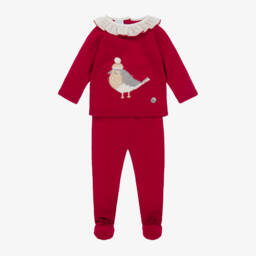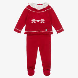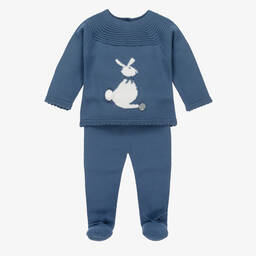 Camel beige two-piece babygrow for boys and girls by Artesania Granlei, made in a soft knit. The top has ribbed detailing around the neck and pretty lacy knitted trims around the cuffs and hem. There are button fastenings on the back, faux pockets with button trims and the brand's signature mother-of-pearl logo charm on the front. The bottoms have cute bow trims and a comfortable elasticated waist.