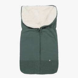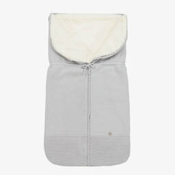 A cosy ivory nest for baby boys and girls by Spanish brand Artesanía Granlei. In a beautifully soft knit, this warmly padded accessory is fully lined in super soft faux fur with a drawstring fastening for a snug and secure feel. It fastens with a full-length zip and is finished with a mother-of-pearl logo charm on the front.