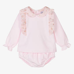 A sweet pale blue top and shorts set for baby girls by Spanish brand Babidu. Both pieces are made in soft cotton jersey and have a cosy fleecy inside. The top has elasticated frilly cuffs, with a classic Peter Pan collar and pretty ruffle trims in a floral gingham pattern. It fastens easily with poppers on the back. The shorts are elasticated around the waist and legs for a comfortable fit.