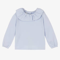 A blue cotton babysuit for girls from Babidu. This timeless design is made in soft, stretchy and comfortable jersey with a smart ruffle collar. There are easy-to-fasten poppers on the back and between the legs for quick dressing and changing.