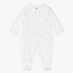 Adorable pale blue babygrow for boys and girls by Babidu. Made in luxuriously soft cotton velour, this sweet one-piece has a cloud and snowflake pattern, and a delicate white bow and charm on the chest. It fastens with poppers on the back and between the legs to make dressing easy.