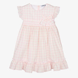Pretty pale blue and white gingham check dress for girls by Spanish brand, Babidu. Made in lightweight cotton, this traditional style has flutter sleeves and smocking detail on the bodice with an appliqué bow. The full, gathered skirt has a lovely ruffled hem to complete the look.