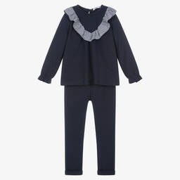 Green cotton trouser set for girls by traditional Spanish brand Babidu, made in soft, comfortable, knitted jersey with a warm brushed inside. The top has a green and white gingham ruffle trim, a keyhole button fastening on the back and gently elasticated, frilled cuffs. The coordinating trousers have cute, fixed turn ups and an elasticated waist to ensure a good fit for little tummies.