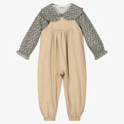 Lovely blouse and dungarees set for girls by Spanish brand Babidu, made in soft cotton twill. The navy blue and pink floral print blouse has a large rounded collar with a frilled trim and sleeves with elasticated ruffled cuffs. The pink dungarees have gathers on the front, elasticated cuffs and button fastening shoulder straps.