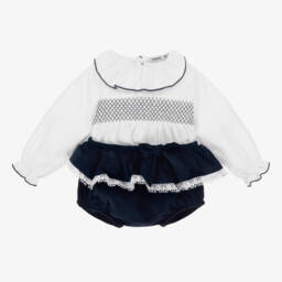 Girls red velour shorts set features a beautifully crafted outfit by Babidu. The soft cotton twill blouse includes charming red smocking and a delicate ruffle collar, complemented by frilly cuffs. Fastened with wooden buttons at the back, it pairs elegantly with the red velvet shorts with a lace-edged ruffle trim and a decorative bow. Elasticated waist and legs provide ease of movement, suitable for special occasions. Limited quantities available—don't miss out.