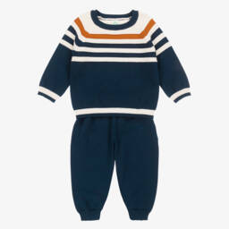 Boys ivory and blue adventure set by Little Me is a charming addition to any wardrobe with its playful jeep motif and cosy design. The soft jersey top features green striped sleeves and wooden button fastenings for a stylish touch. The matching navy trousers come with a comfortable elasticated waistband. Perfect for autumn and winter outings, this set is available in limited quantities. Last chance to buy this exclusive design and keep your little one warm and fashionable.