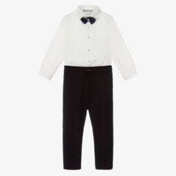 Boys blue print trousers set by MARC JACOBS features a delightful ensemble perfect for the cooler seasons. The set includes a soft cotton top, cosy trousers, and a matching jacket, all adorned with a subtle all-over logo print. Designed for junior boys, this outfit offers both style and comfort, with easy snap fastenings for quick dressing. Limited quantities available, making it the last chance to buy this charming set for the upcoming season.