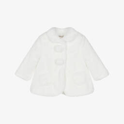 Girls ivory faux fur coat by Mayoral offers a soft and plush feel. Designed for warmth and comfort, it features a silky smooth lining and secures with large, fabric-covered buttons. The addition of two front pockets enhances its charming appeal. Ideal for keeping cosy during cooler months, this coat is perfect for stylish outings. Limited quantities available, making it a last chance to buy this exquisite piece.