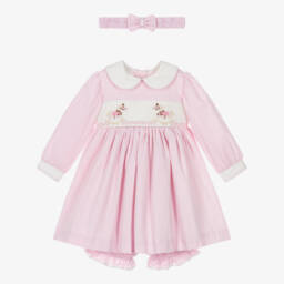 In a lovely shade of ivory, this dress set for baby girls by Pretty Originals is made in soft and comfortable jersey. Traditionally styled, the dress has a delicate pink bow on the sailor collar, with button fastenings and a large bow on the back. It comes with a matching bonnet and pair of bloomer shorts.