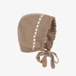 This lilac bonnet for baby girls by Artesanía Granlei, features a lovely circular pattern on the back. Finely knitted, it has delicate white scalloped trims and a sweet heart-shaped mother-of-pearl logo charm on the side. Fastening with ties under the chin, it is both charming and practical.
