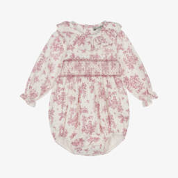 This charming burgundy red shortie for baby girls by Piccola Speranza, is made in soft, lightweight cotton. A lovely addition to any wardrobe, it has a delicate floral pattern, with a sweet ruffle collar and a white pintuck bib. Fastening with buttons on the back and between the legs, it has elasticated cuffs and legs for a comfortable fit.