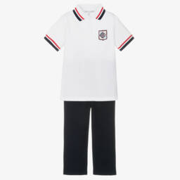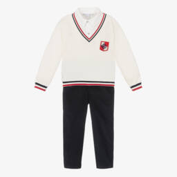 Baby girls ivory two piece trouser set by British heritage brand Beatrice & George. Classically styled and exclusive to Childrensalon, the outfit is knitted in a soft cashmere and wool blend with cosy, ribbed trims. The cardigan has pink knitted hearts and button fastenings on the front, whilst the coordinating trousers have a gently elasticated waistband, just right for little tummies.