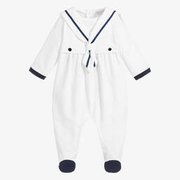 Exclusive to Childrensalon, a navy blue and white cotton babygrow for boys and girls by British heritage brand Beatrice & George. Made in luxuriously soft, comfortable jersey, it has a traditional sailor collar made in poplin and trimmed in navy blue grosgrain ribbon. There are decorative buttons on the front and matching grosgrain trims on the cuffs. It fastens with poppers on the back and between the legs.