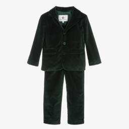 Exclusive to Childrensalon, a smart, traditional, brushed cotton suit for boys by British heritage brand Beatrice & George. The green, black and yellow tartan jacket has black velvet trims and a varsity-style, embroidered logo crest badge on the front. The black trousers have slanted front pockets and a useful, adjustable waistband for an ideal fit. Both the jacket and trousers are fully lined in black satin for comfort. To complete the look, it comes with a coordinating, adjustable, tartan bow tie.