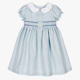 Exclusive to Childrensalon, a pink and white striped dress for little girls by British brand Beatrice & George, made in lightweight cotton. Traditionally-styled, it has hand smocking across the bodice with pink floral embroidery and a frilly white collar with a pink ribbon bow. The pretty puffed sleeves have coordinating pink bows, white piping and picot trims. The gathered skirt has a sash around the back that ties in a bow. The dress comes with useful, matching, lined cotton bloomers that have hand smocking on the front of the waistband and frills across the back.