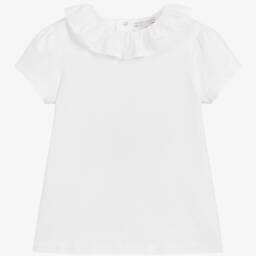 Girls white cotton T-shirt by British heritage brand Beatrice & George, with a beautiful ruffled voile collar. Exclusive to Childrensalon, it is made in luxuriously soft, comfortable jersey, with prettily puffed, short sleeves, picot trims and back popper fastenings.