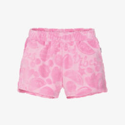 Baby girls pink cotton bloomer shorts by Beau KiD. These cute lace-trimmed pants have satin ribbon bows and an organza frill, with a diamanté crown decoration on the back. They have an elasticated waistband and leg holes.