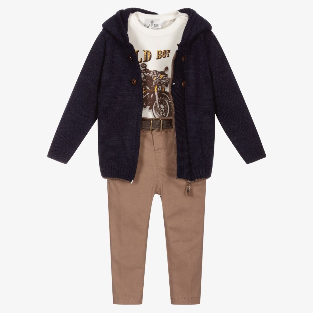 Baby boys three piece trouser set by Beau KiD. The navy blue hooded cardigan is knitted in a soft acrylic and wool blend, with a zip fastening beneath a button placket. It has beige trim and beige elbow 'patches'. The ivory cotton jersey top has a brown and gold motorbike and slogan print, with popper fastenings on one shoulder. The beige twill trousers have an adjustable waist and come with a detachable faux leather belt.