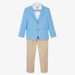 Boys beige and blue five-piece tailored suit by Beau Kid. The beige blazer has navy blue trims and front button fastening and comes with a matching bow tie with an adjustable neck strap. Also included is a blue Oxford weave shirt, navy blue chino trousers and buckle fastening belt.