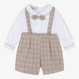 Traditional blue shorts set for little boys by Beau KiD. The long-sleeved white cotton shirt has a sweet collar, pintuck detailing, and a fixed bow-tie on the neck. There are button fastenings on the back and cuffs, and contrasting navy blue piping for a classic finish. Fully lined, the shorts have braces that fasten with buttons on the front, and a comfortable elasticated waist.