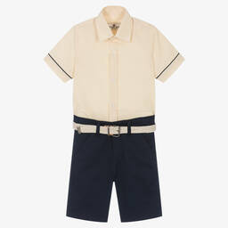 Boys blue striped shirt and navy blue shorts set by Beau KiD. The shirt is woven in a soft and lightweight cotton blend and has a pointed collar, blue trims, and front button fastening. The smart shorts are Bermuda length and come with a plaited belt that has a buckle fastening. They fasten with a button and zip and have belt loops, side slant pockets and faux pockets on the back.