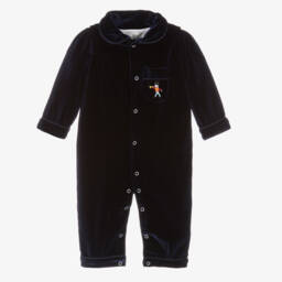 Baby boys red velvet romper by Beau Kid. Soft and luxurious, this stylish onesie has a chest pocket with an embroidered toy soldier on the front and a rounded collar. There are poppers to fasten all the way through, with a popper on the legs. It is fully lined in soft cotton for comfort.