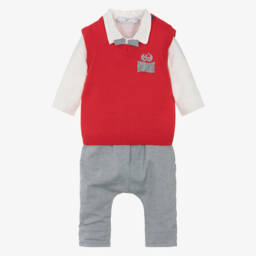 Boys navy blue trousers and blue shirt set by Beau KiD offers a delightful set for junior boys. The smooth poplin shirt features a charming pinstripe design and an attached bow tie, adding a touch of sophistication. The soft twill trousers provide comfort with an elasticated waist, and the detachable braces offer styling options. Limited quantities available, suitable for autumn and winter occasions.