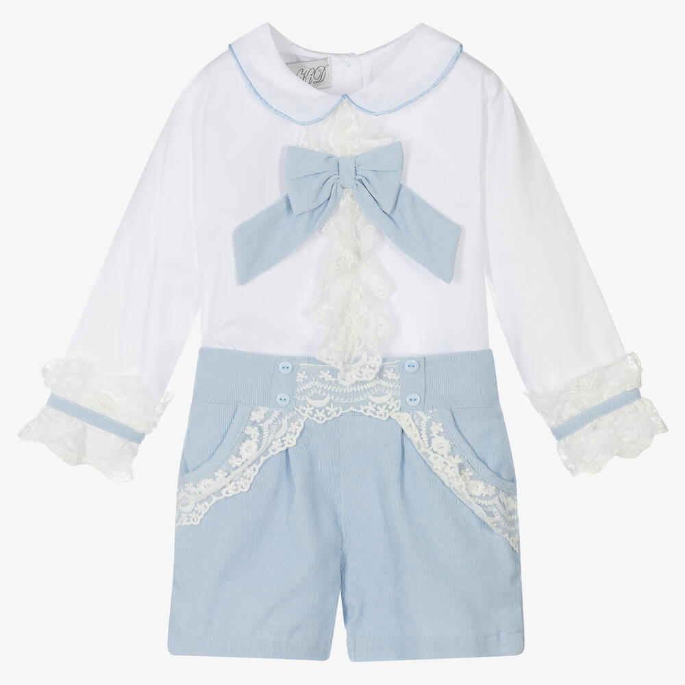 Pretty and feminine for girls, this traditionally styled shorts set is by Beau KiD. Made in fine corduroy with a lightweight cotton voile lining, the pale blue shorts have a comfortable elasticated waist and a side zip fastening. The front is trimmed in beautiful white lace and has faux button detailing. Woven in smooth cotton poplin with back button fastenings, the white blouse has matching lace trims and a stand-out corduroy bow.