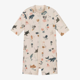 Beige UPF40+ sun suit for little boys and girls by Danish brand, Liewood. Made using recycled materials from plastic bottles, this playful suit has a cute, sage green crab print. It fastens with a smooth zip on the front for easy dressing, with a chin guard at the top for added protection. Lovely for splashing in the pool or sea, it is super lightweight and fully lined.