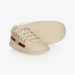 Beautiful beige and ivory pre-walker shoes for baby boys and girls by luxury Italian brand Gucci. Made from soft cotton jacquard, the fabric is woven with the designer's Double G logo. They are lined in comfortable smooth leather and fasten with a buckle around the ankle. They have a soft flexible sole and a light padded insole to support your little one's feet when moving around.