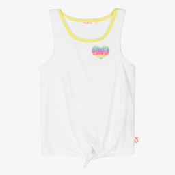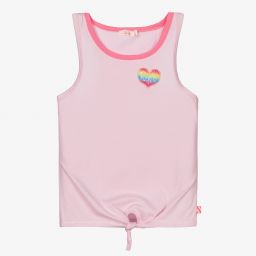 Pale blue vest top for girls by Billieblush. Made with soft and stretchy cotton jersey, it has a neon pink neckline, a tie detail on the hem, and a glittery padded heart in rainbow colours on the chest.