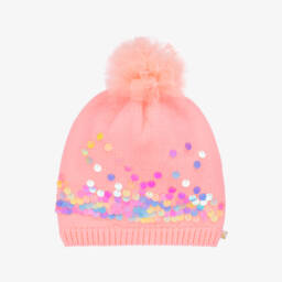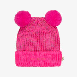A girls blue and pink glitter pom-pom hat by Billieblush is knitted in a cosy viscose blend. Featuring a sparkling metallic thread, it showcases a charming purple, yellow, and pink heart pattern. The design is completed with a super soft pink faux fur pom-pom on top and a neon pink logo patch on the turn-up brim. Limited quantities available, get yours now for a warm and stylish winter accessory.