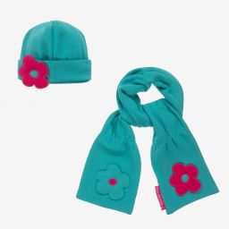 Ivory hat and scarf set for little girls by Billieblush. The hat is made in soft faux fur, with a warm polar fleece trim and lining. It has a cute pink bobble on the top and straps to secure it under the chin. The ivory scarf is made in soft and cosy polar fleece, with a bright pink reverse. Both pieces have rubberised logos.