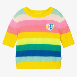 This delightful green knit sun sweater for girls by Billieblush features a charming jacquard design with gold sequin sunrays, iridescent clouds, and neon pink towelling hearts. Crafted with ribbed trims on the neckline, cuffs, and hem, it includes a branded tab on one side. Suitable for adding a touch of fun to autumn and winter wardrobes, this cosy sweater is available in limited quantities, making it a last chance to buy.