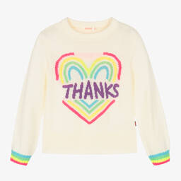 A bright green sweater for girls by Billieblush, with an intarsia rainbow heart and 'Good Mood' motif. Soft and cosy, it is knitted in a soft wool blend with ribbed trims and matching rainbow stripes on the cuffs and a logo tab on the side seam.